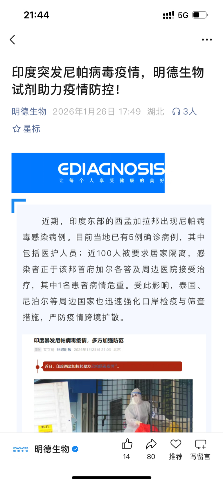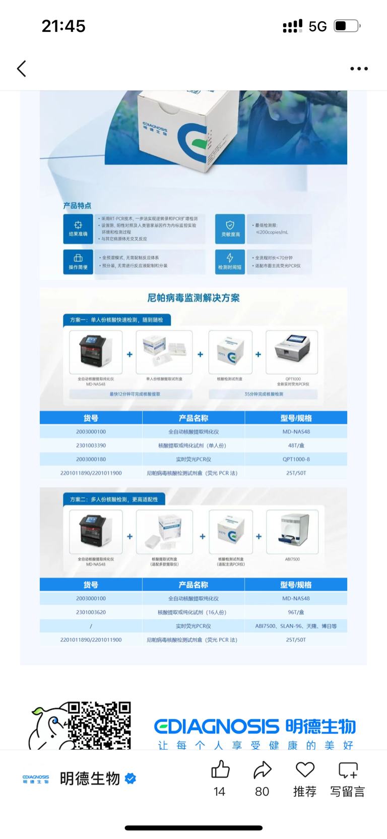 $达安基因(SZ002030)$ $之江生物(SH688317)$ $明德生物(SZ002932)$ 看到今天主力一早就把达安,之江拉涨停了,说明主力也是仓促抢筹,没有时间做足功课。大家去访问一下明德生物的微信公众号,就会发现明德生物的尼帕检测试剂都已经生产出来了,厉害吧?!明天剧情会翻转吗?拭目以待!