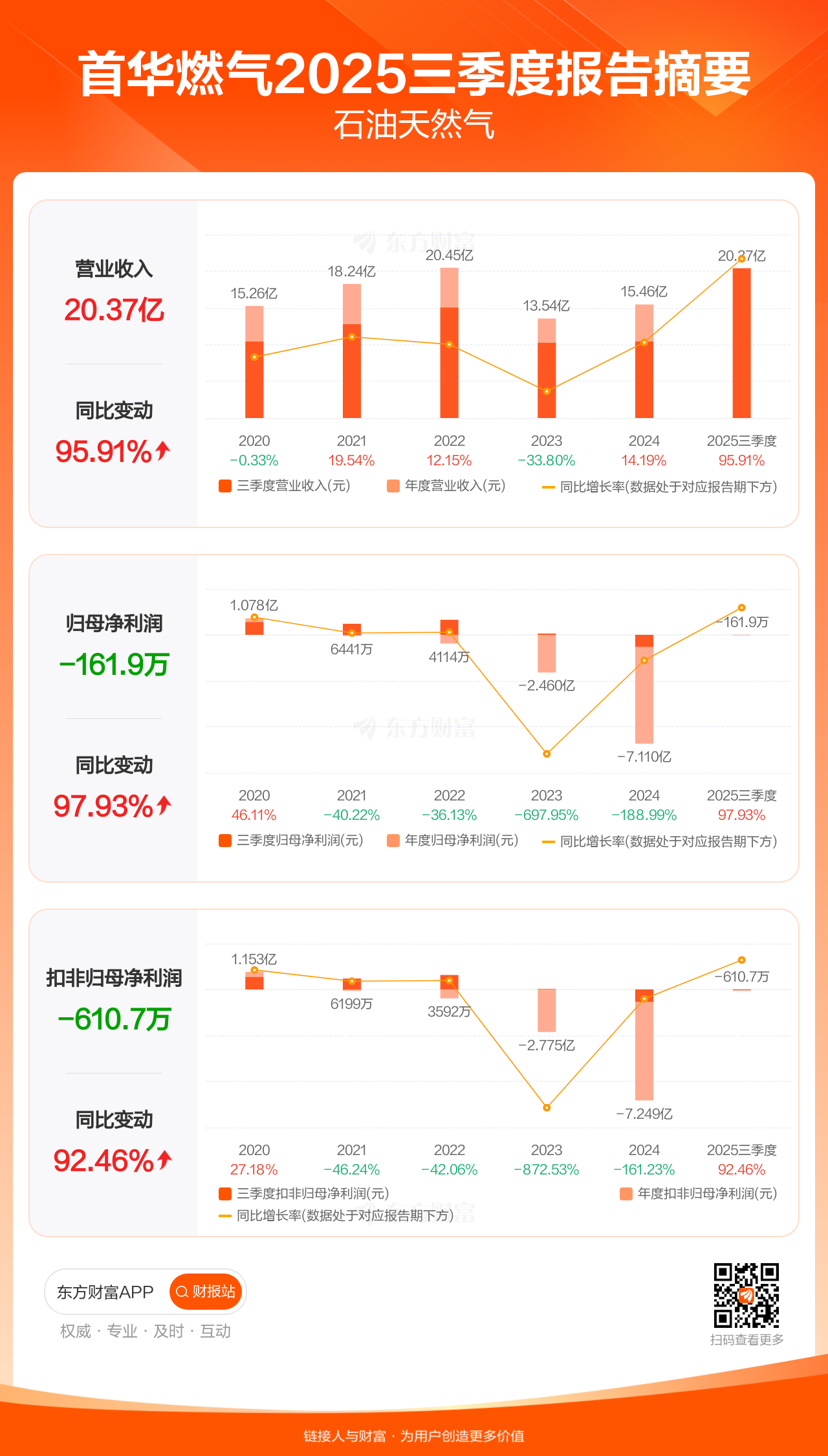 首华燃气10月29日发布2025年三季报显示,公司前三季实现营业收入20.37亿元,同比增长95.91%;归母净利润-161.90万元;扣非归母净利润-610.74万元。
