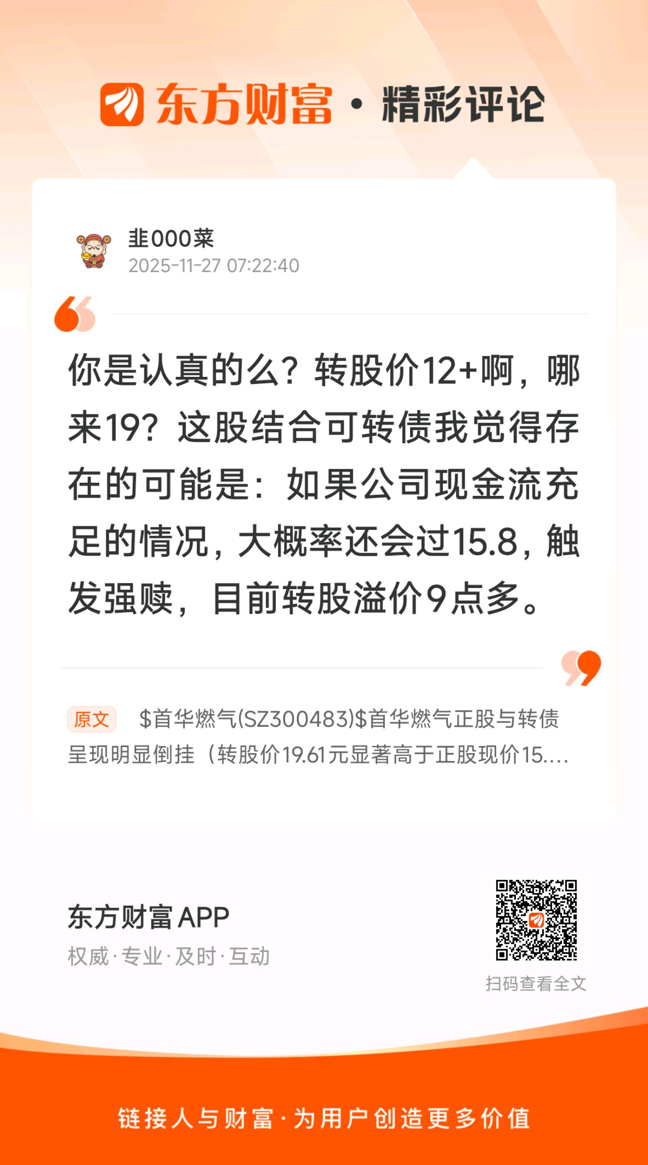$首华燃气(SZ300483)$ 首华燃气正股与转债呈现明显倒挂(转股价19.61元显著高于正股现价15.02元),转股意愿极低,但转债因债底支撑溢价率仅3.75%,短期正股走势需关注冬季气价反弹与商誉减值落地后的修复机会,长期增长则依赖深层煤层气开发进度。
