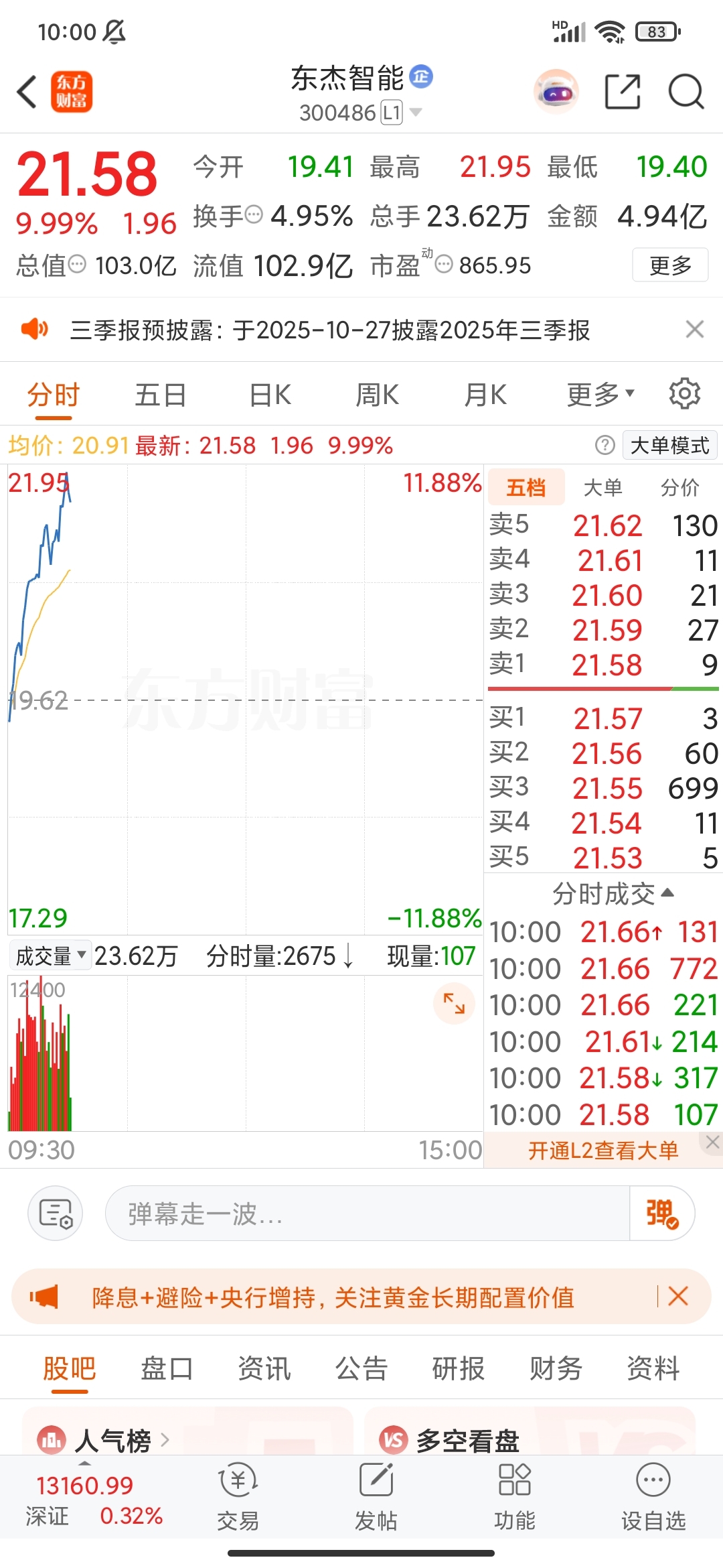 $东杰智能(SZ300486)$ 今天果真直线拉升,够猛……21上方还是不建议追高