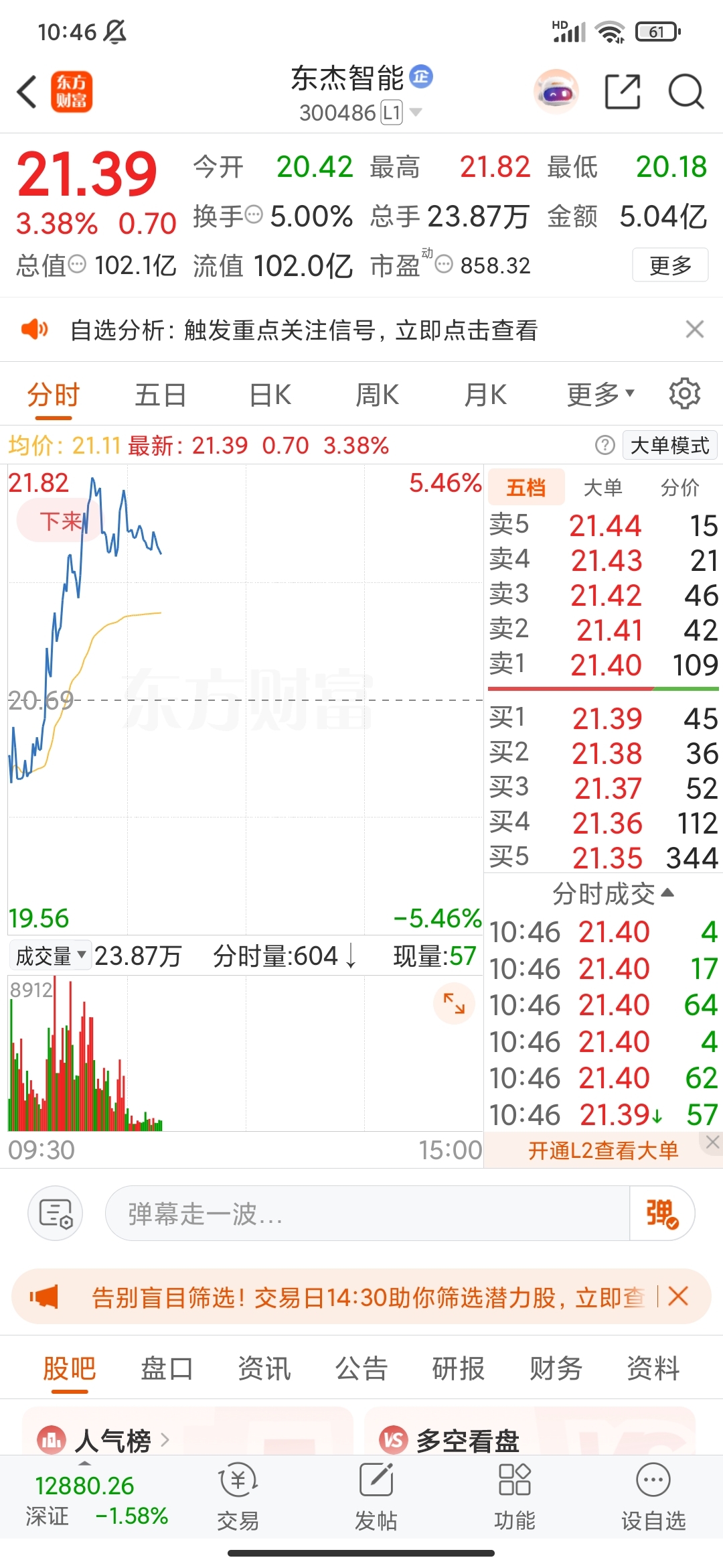 $东杰智能(SZ300486)$ 一直想入没入的合肥城建涨停,风险也开始大了,大盘大跌,昨天没入东杰智能今天表现就算不错了,今天收盘要是站稳20.88,下周有望看到23.88!看下午会回落多少了……