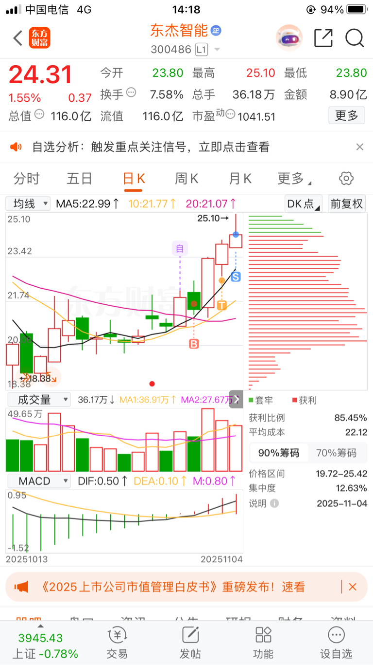 $东杰智能(SZ300486)$ 四个交易日,赚20个点清了,第一次买创业板,开门红