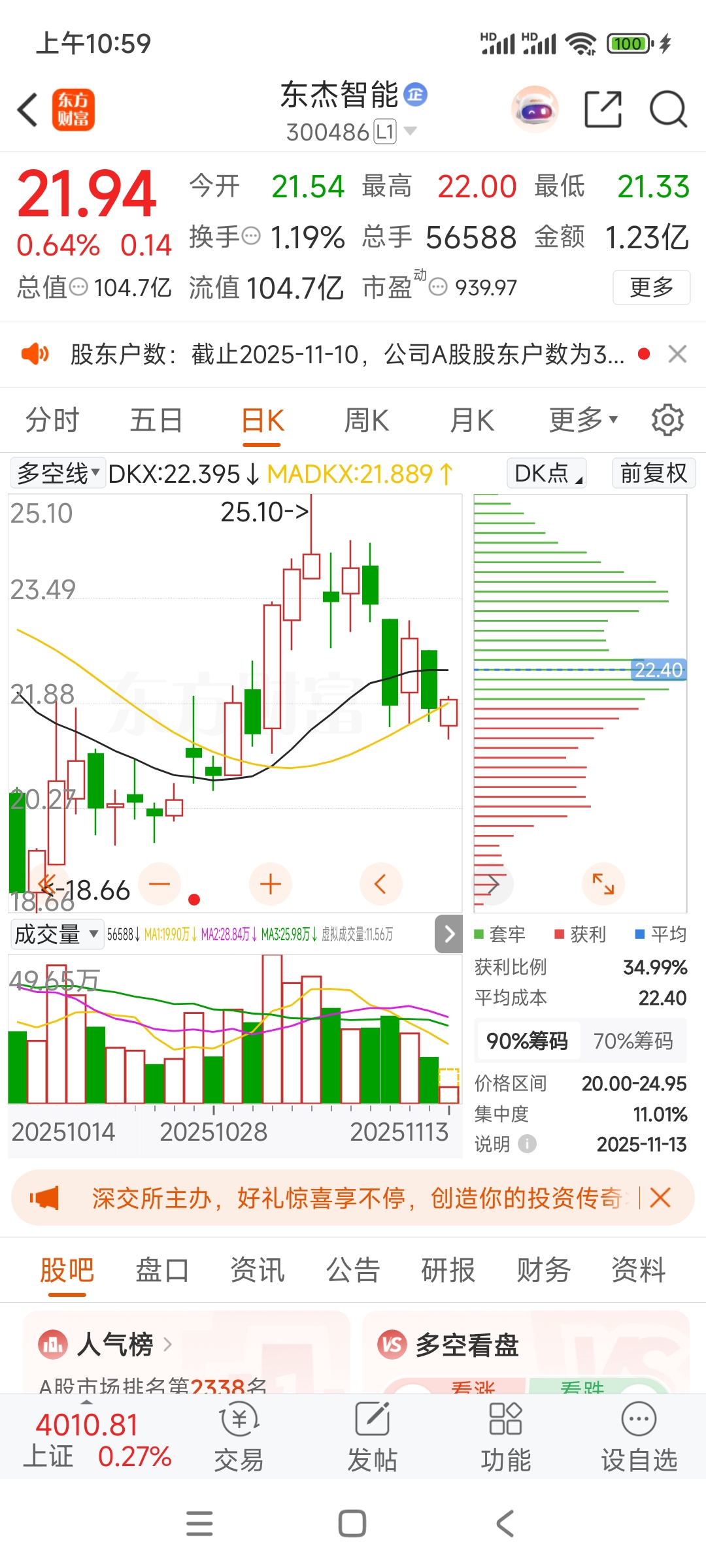 $东杰智能(SZ300486)$ 自前天发筹码集中度到11.01,昨天至今天筹码集中度一变不变了,这是被控制了还是真的一点没变动?