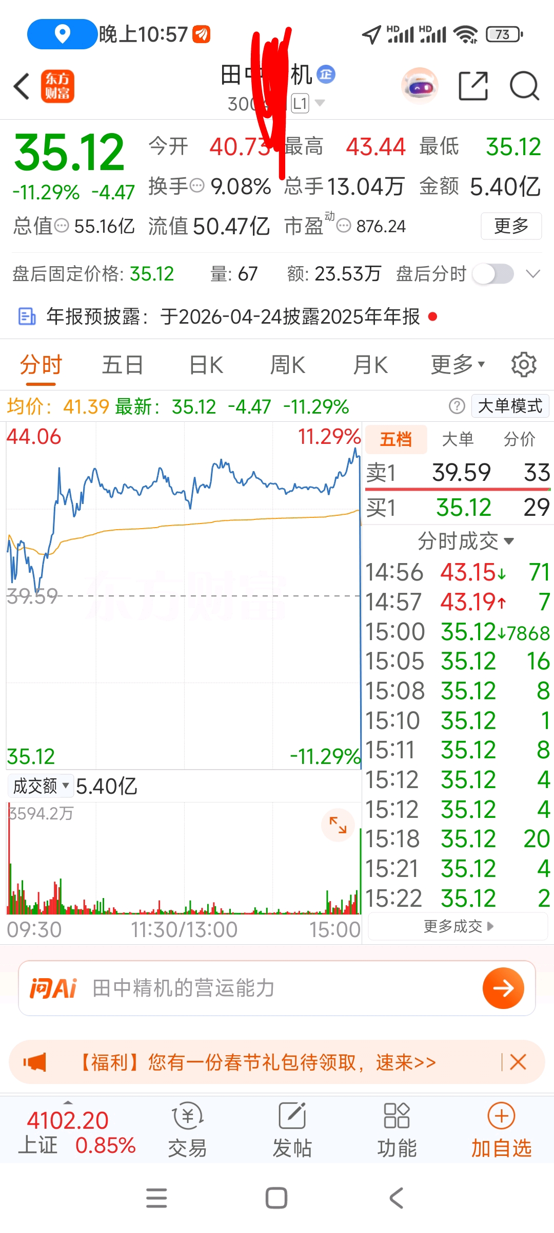 $东杰智能(SZ300486)$ 从大涨九个点到跌11个点需要多久?只需要数秒钟,7868手!这市场没法说……!