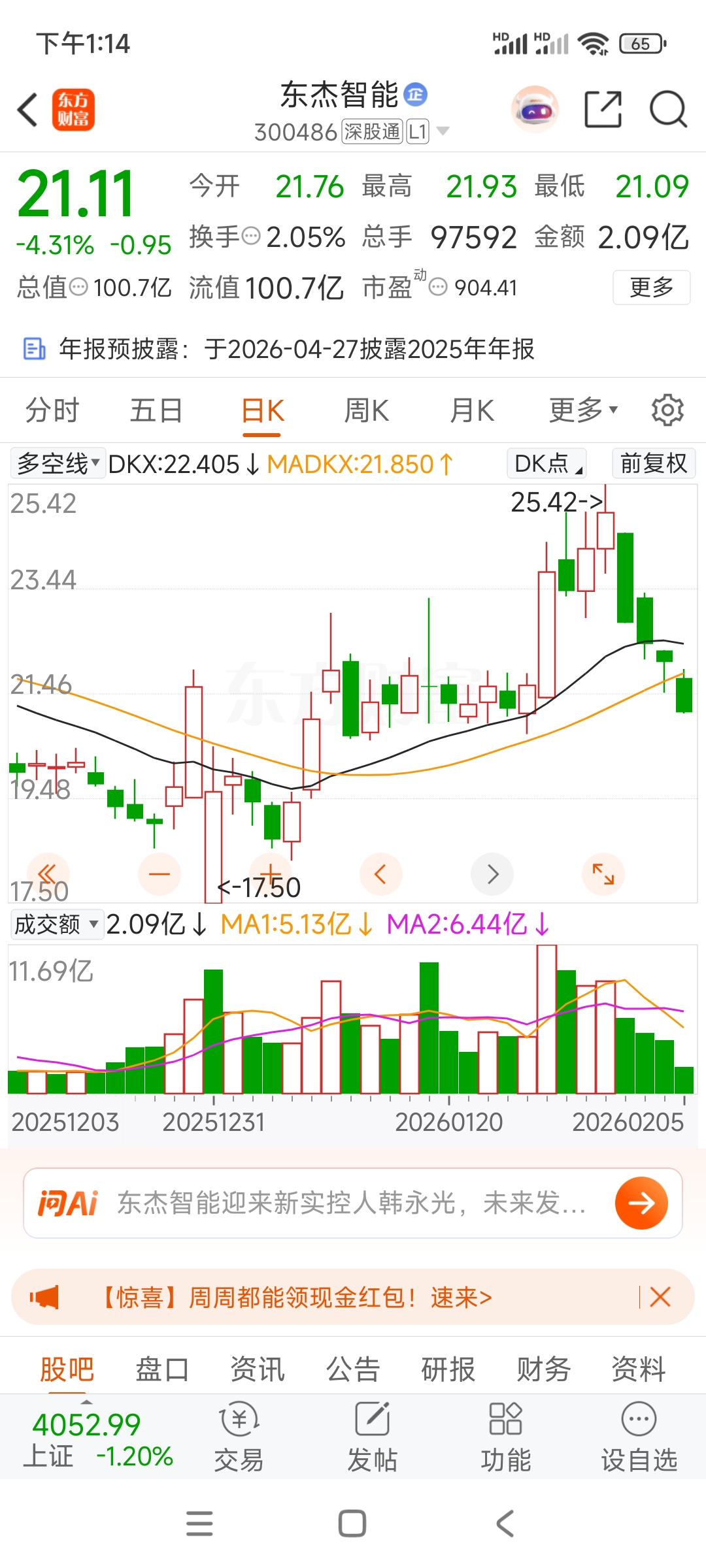 $东杰智能(SZ300486)$ 大跌四天还未见止跌迹象,上市公司某些人是偷偷做了一些缺德事吗?还是两个大协议真是用来画饼的?问董秘问题问了那么多就回复一个,也不是啥玩意,目前股价有参与价值,想入的可以分批逢低入,胆量大的还是适合外面参与高风险高收益个股!