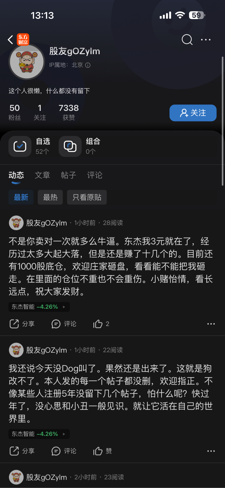 $东杰智能(SZ300486)$ 双标小丑,让人拿的是你,自己减仓看空也是你,高喊别人指导别人,自己天天莫名其妙的各种分析引导大家情绪,谁是小丑?谁是坏人?这种人恶心,不逗苟了,走了走了,此股我跟踪了一段时间,这是一个做T的好股,话说到这里,至于博弈什么重组彩票的人,从商业航天到核聚变,脑机进口,ai应用,有色,一个月过来,外面的世界一样美好,点到为止,再见