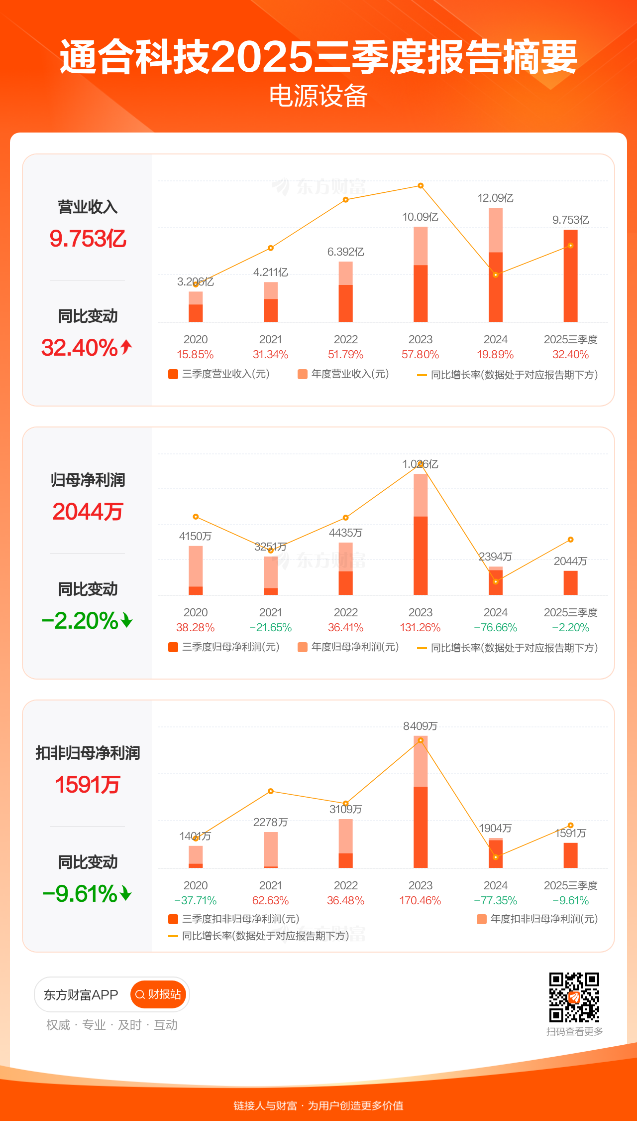 通合科技10月30日发布2025年三季报显示,公司前三季实现营业收入9.75亿元,同比增长32.40%;归母净利润2043.78万元,同比下滑2.20%;扣非归母净利润1590.94万元,同比下滑9.61%。