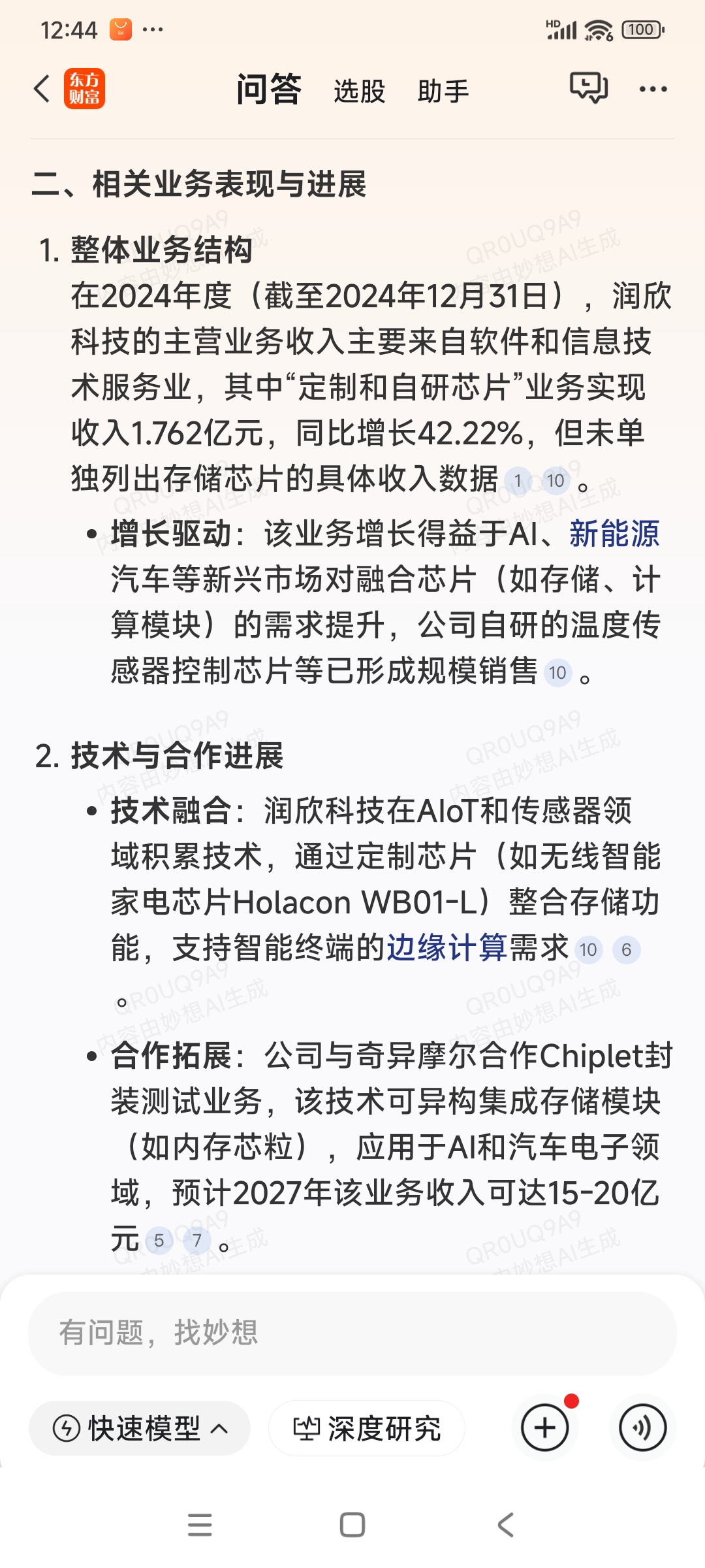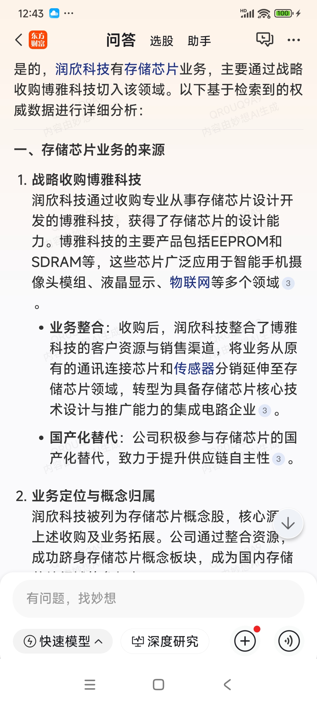东方财富的妙想,实锤。润欣科技有存贮芯片业务