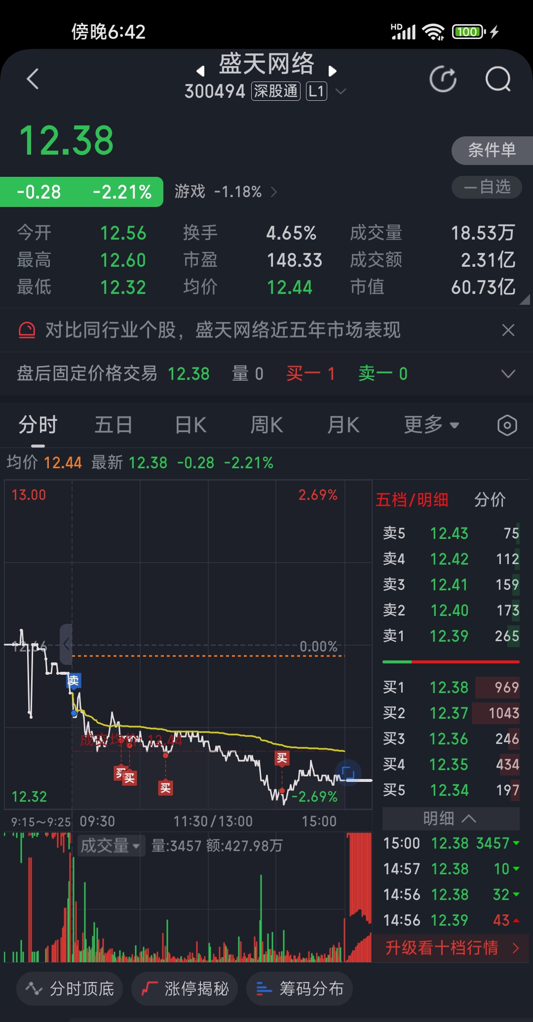 $盛天网络(SZ300494)$ 这货业绩好也没用,前几天12.87建仓早了点,做T也只降到12.6,反弹太弱赶不上勾庄砸盘速度还是亏,莫非勾庄这是要奔着下方11~10.77那个缺口去?