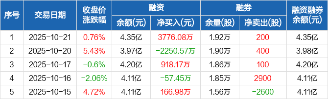 融资方面,当日融资买入5215.21万元,融资偿还1439.13万元,融资净买入3776.08万元。融券方面,融券卖出200股,融券偿还0股,融券余量1.92万股,融券余额20.28万元。融资融券余额合计4.35亿元。