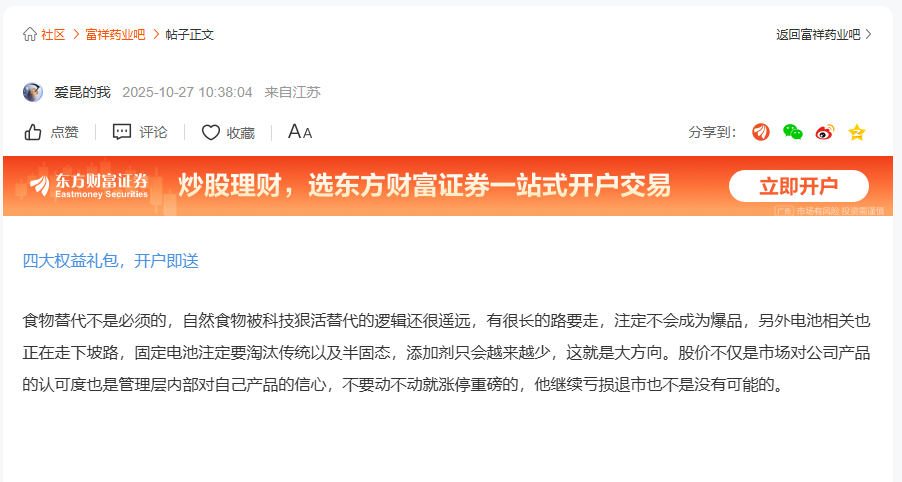 温馨提示: 1.根据《证券法》规定,禁止编造、传播虚假信息或者误导性信息,扰乱证券市场;2.用户在本社区发表的所有资料、言论等仅代表个人观点,与本网站立场无关,不对您构成任何投资建议。用户应基于自己的独立判断,自行决定证券投资并承担相应风险。《东方财富社区管理规定》