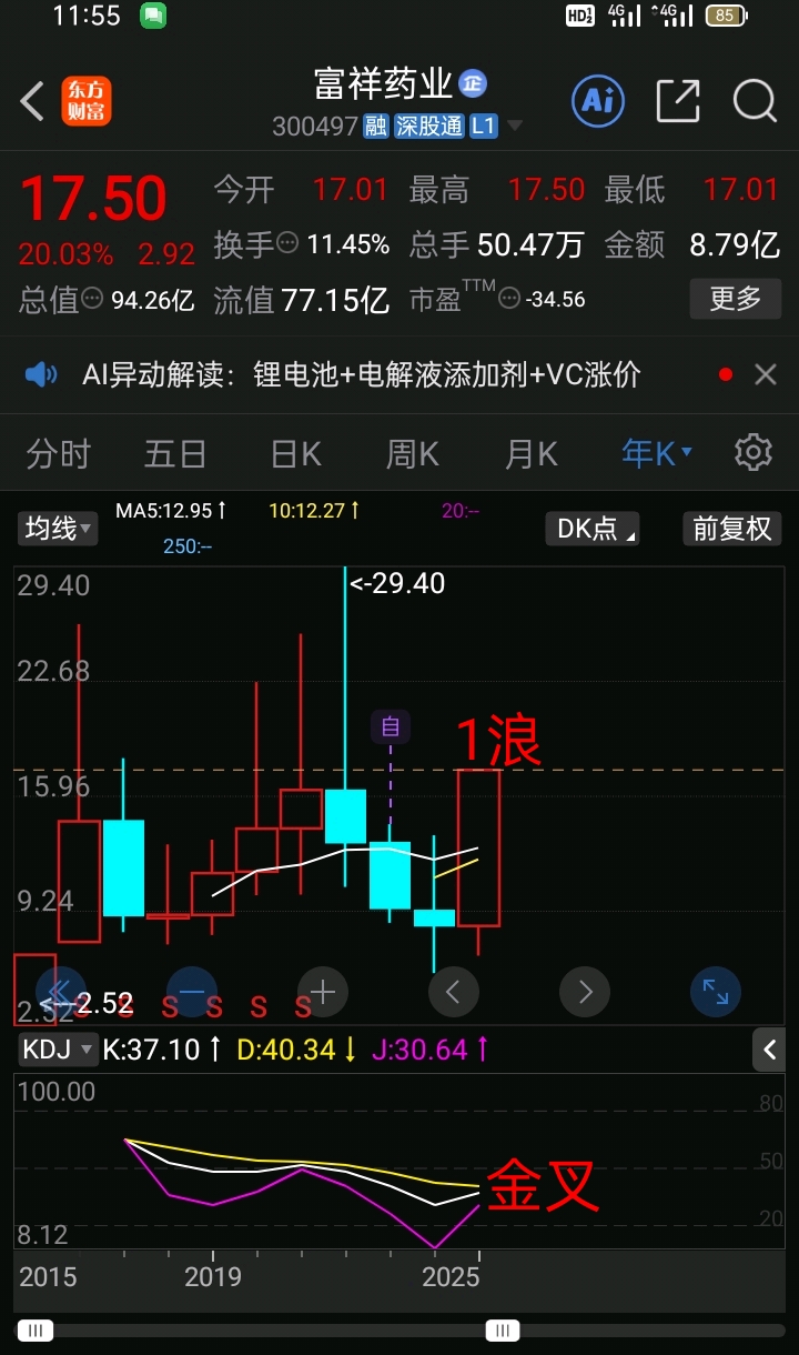 $富祥药业(SZ300497)$ W底+1浪+kdj低位金叉