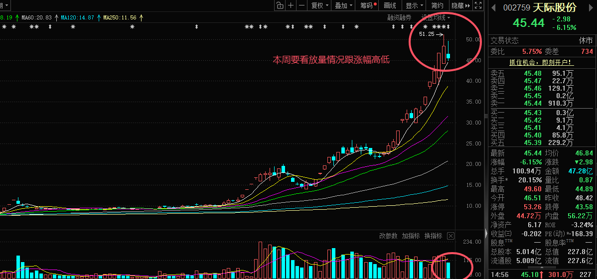 $天际股份(SZ002759)$跟多氟多我从技术面看这一波的走势差不多就该到头了,这个到头的意思不是说明天一下子就结束,不是这个意思,我的意思是指本周差不多是一个阶段S点,已经过了B点的时候了,上一周我一直再说找B,因为上周从时间点上来看确实还不到S的时候,上周大胆找了B以后这周怎么样都是有盈利出局们就是赚多赚少。