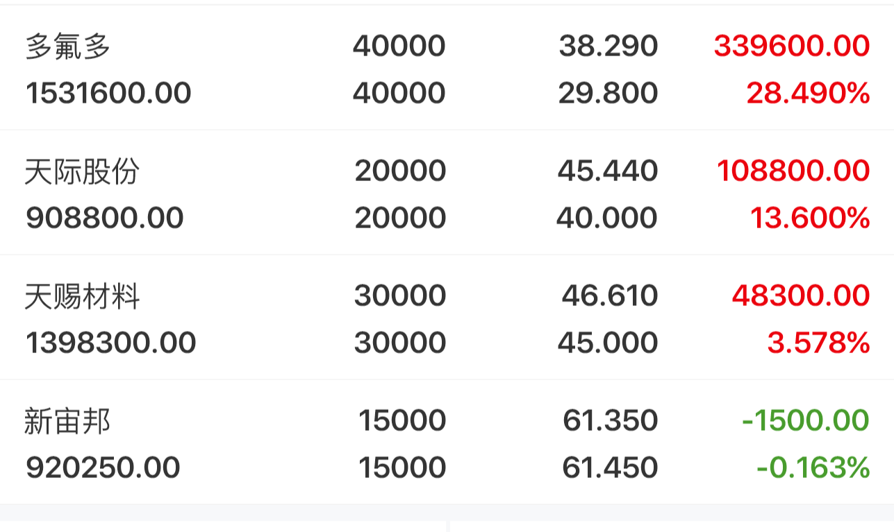 $新宙邦(SZ300037)$跟天赐材料这两个我可能会考虑多拿两天,这一波涨幅是最小的,从板块到技术面来分析看,新宙邦是上周四才启动阳线,周五调整那么今天是有可能继续放量上涨,而且它涉及的是VC电解液这块,风口是刚刚起势,行情后期可观。天赐材料再多氟多跟天际股份对比,它的涨幅是最小的但它再行业里面的六佛磷酸锂产能又是最大的,所以它我会考虑多拿两天看看它的走势,毕竟盘子大走势不好掉头,大资金不至于短线结束的那么快,天际跟多氟多这类走势很明显就是柚子带动炒作的多一些,多多少少有点脱离基本面了。当然炒作阶段谁都喜欢,但到了一定阈值的时候就要特别注意,回落的时候也是最快的。