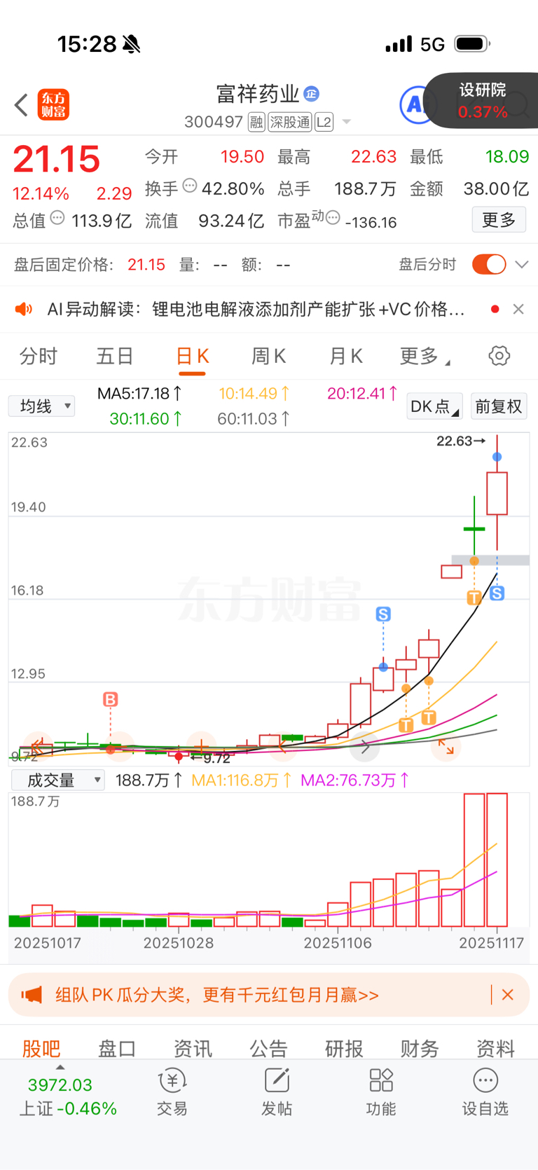 $富祥药业(SZ300497)$ 今天全走了,感谢,一个月不到翻倍