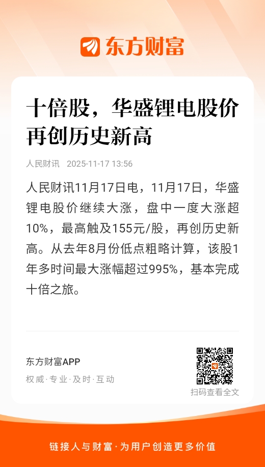 人民财讯11月17日电,11月17日,华盛锂电股价继续大涨,盘中一度大涨超10%,最高触及155元/股,再创历史新高。从去年8月份低点粗略计算,该股1年多时间最大涨幅超过995%,基本完成十倍之旅。