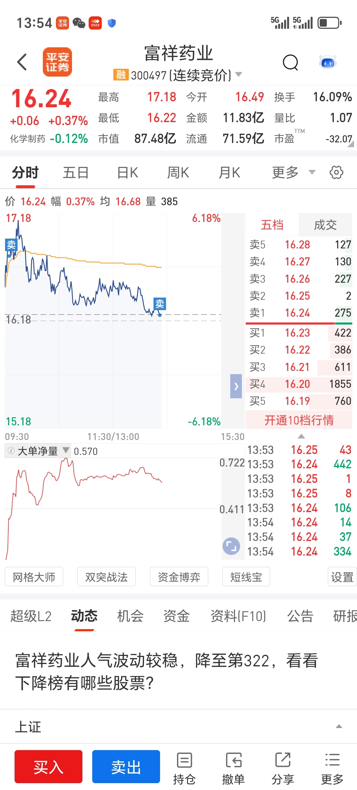 $富祥药业(SZ300497)$ 1624卖了估计亏了,不过真的很气,17多不卖说格局一下,他就一路跌