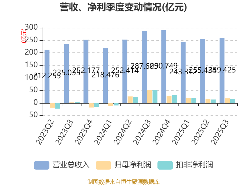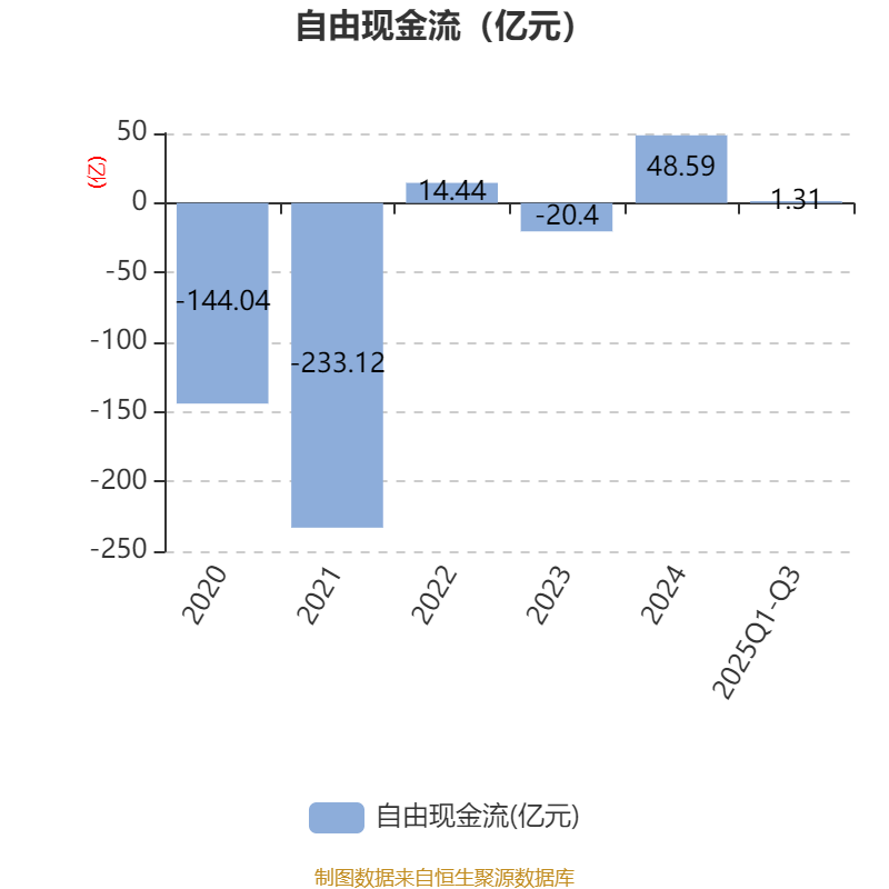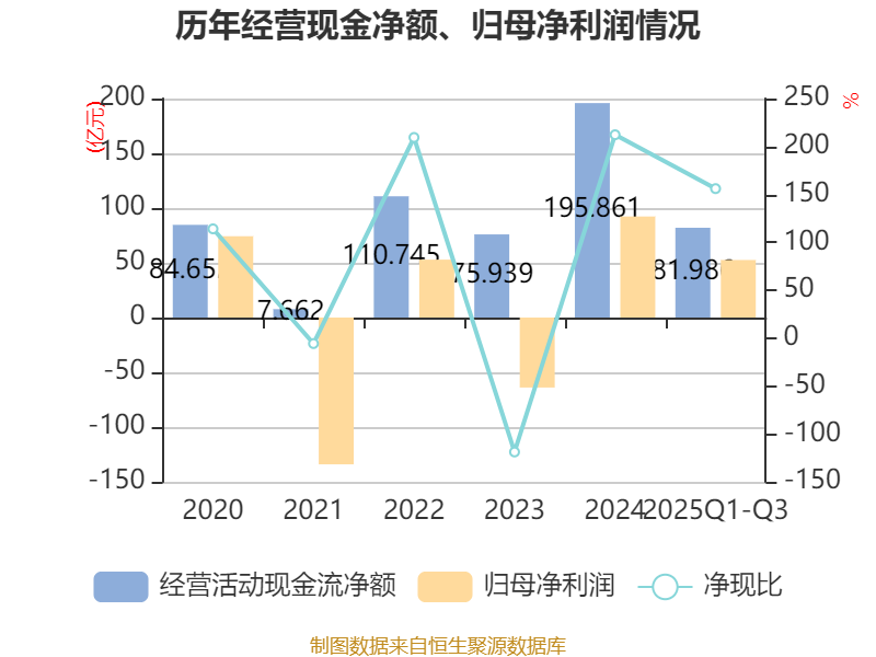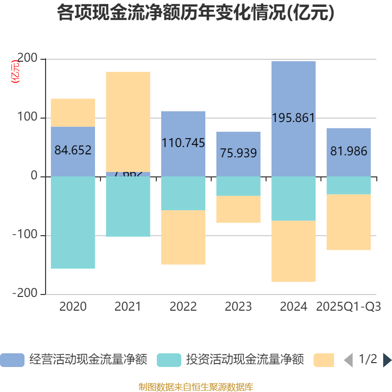 2025年前三季度,公司经营活动现金流净额为81.99亿元,同比下降34.79%;筹资活动现金流净额-94.63亿元,同比减少32.75亿元;投资活动现金流净额-30.62亿元,上年同期为-56.65亿元。