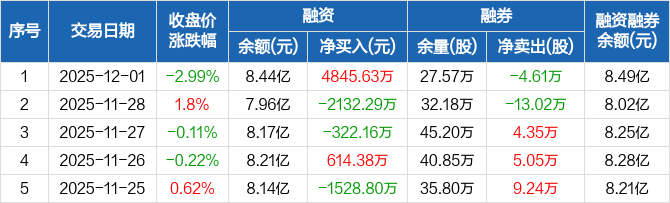融资方面,当日融资买入1亿元,融资偿还5178.09万元,融资净买入4845.63万元。融券方面,融券卖出1.83万股,融券偿还6.44万股,融券余量27.57万股,融券余额483.58万元。融资融券余额合计8.49亿元。