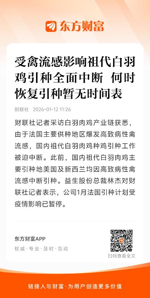 财联社记者采访白羽肉鸡产业链获悉,由于法国主要供种地区爆发高致病性禽流感,国内祖代白羽肉鸡种鸡引种工作被迫中断。此前,国内祖代白羽肉鸡主要引种地美国及新西兰均因高致病性禽流感中断引种。益生股份总裁林杰对财联社记者表示,公司1月法国引种计划受疫情影响已暂停。当前,海外引种已经全部停止,何时恢复引种目前没有明确消息。据悉,2025年我国祖代白羽肉鸡的引种量约为62万套,法国为唯一种源地。