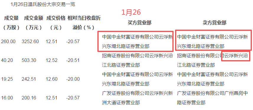 1月26晚盘:服,服,大宗,温氏股分压不住4天亏20%大宗,从之前中信证券和中金$中金公司(SH601995)$ 直接增加了招商证券$招商证券(SH600999)$ 和广发$广发证券(SZ000776)$ 席位玩20%折价大宗。参与方全在云浮新兴路为主。实在是想不明白了