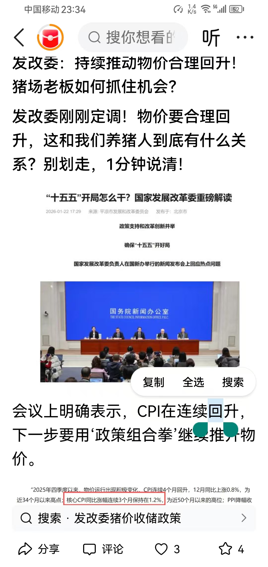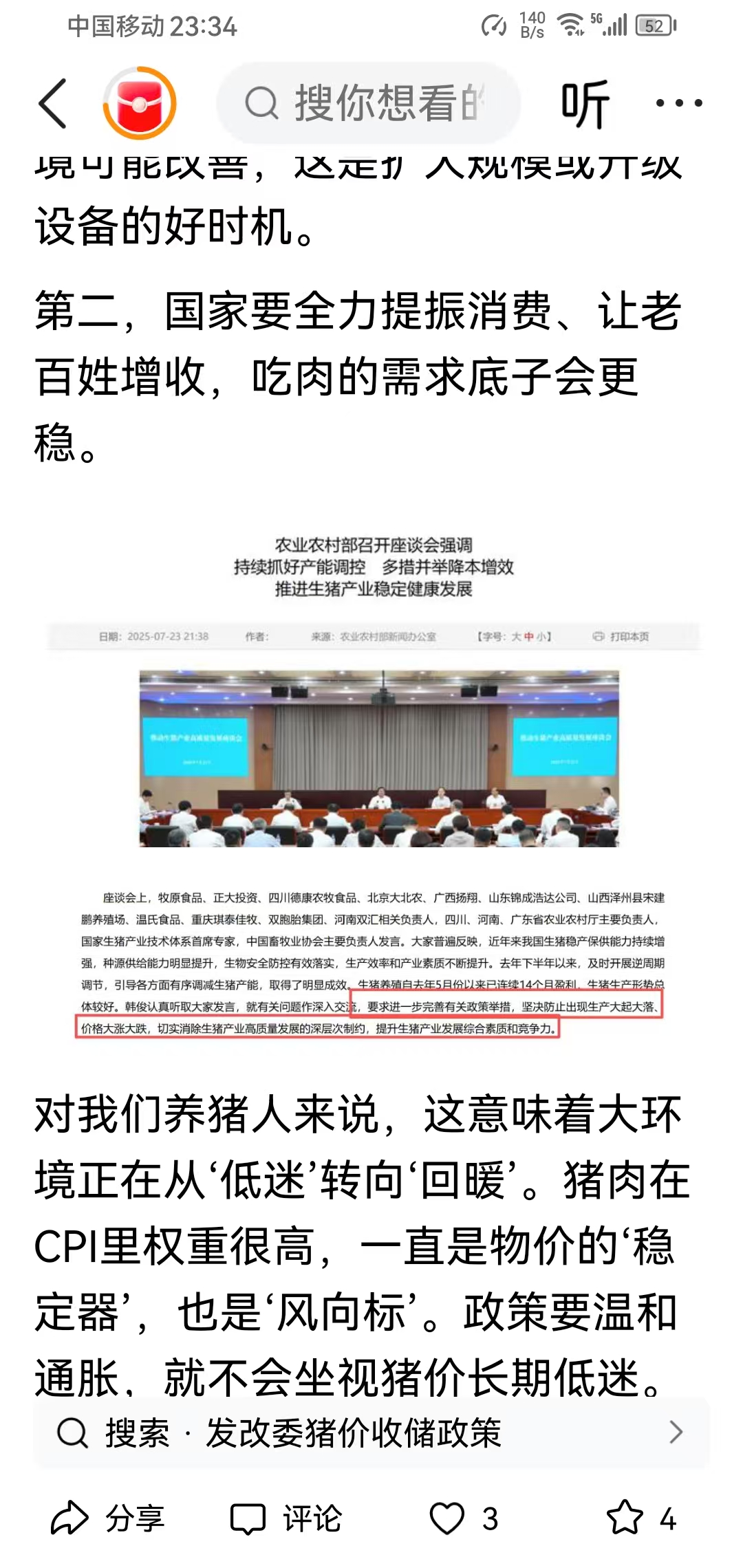 发改委:温氏还底部割肉压盘?物价要合理回升,CPI代表猪肉回暖硬信号。而且猪肉板块$牧原股份(SZ002714)$ $新希望(SZ000876)$ $正邦科技(SZ002157)$ 的春天要提前到来,结束长达1年的养猪不出栏就亏钱的状况还远?