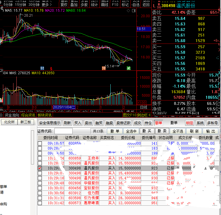 快,快,马上收盘。温氏猪肉挂15.55能进?今天早上的挂单这早上机会不大了。下午