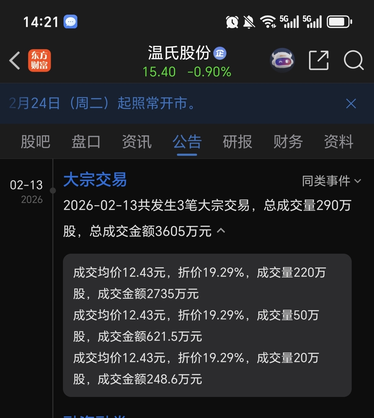 $温氏股份(SZ300498)$ 大宗交易又开始减持了,成交价12.43