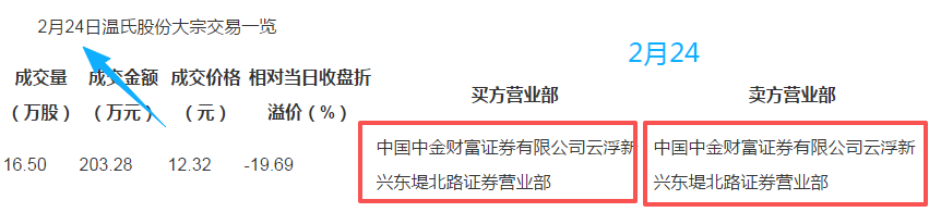 2月26温氏股份实盘解大宗,借中金密集大宗亏20%在云浮新兴同一席位对倒,今天早