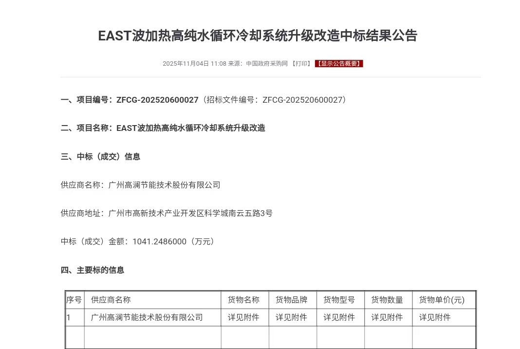 $高澜股份(SZ300499)$ EAST波加热高纯水循环冷却系统升级改造中标结果公告 中标人:高澜股份