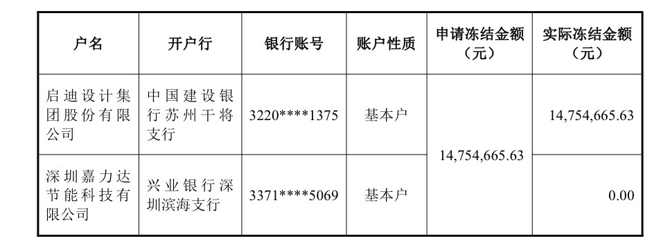2月13日,启迪设计(300500.SZ)发布关于公司银行账户部分资金被冻结的公告。