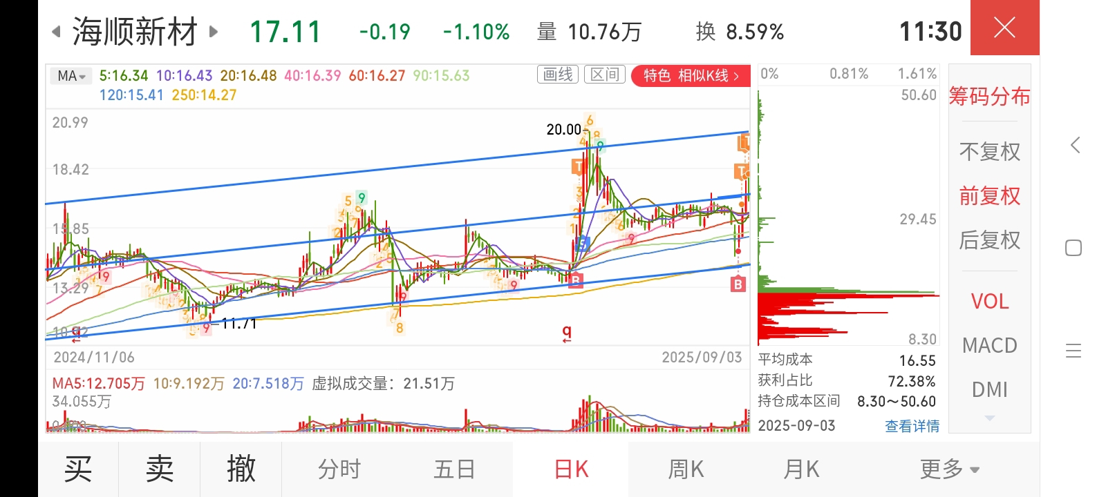$海顺新材(SZ300501)$ 股价在通道中轨遇阻。