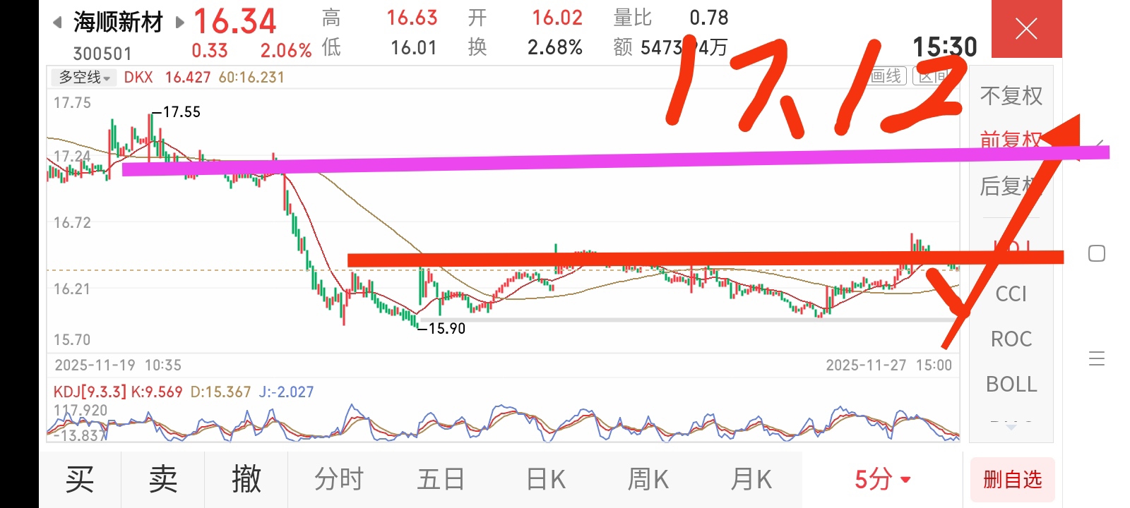 $海顺新材(SZ300501)$ 今日突破了前期高点16,55,这样上面的空间就基本成形,短期回调后会向17.12发起冲击。