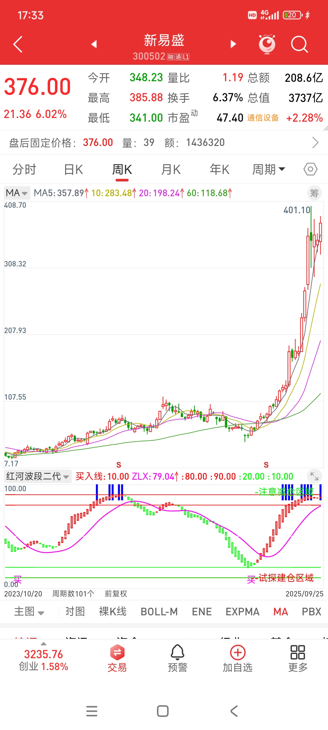 $新易盛(SZ300502)$ 周线来说,这里最多算最后的疯狂,一旦刹车,很容易见周期性大顶,这里纯粹就是持筹者的盛宴,短线就别追了,套在大顶上就很麻烦。日线和60分钟线都是红柱,涨可以涨,但是不建议追,只建议有低位成本的拿着。