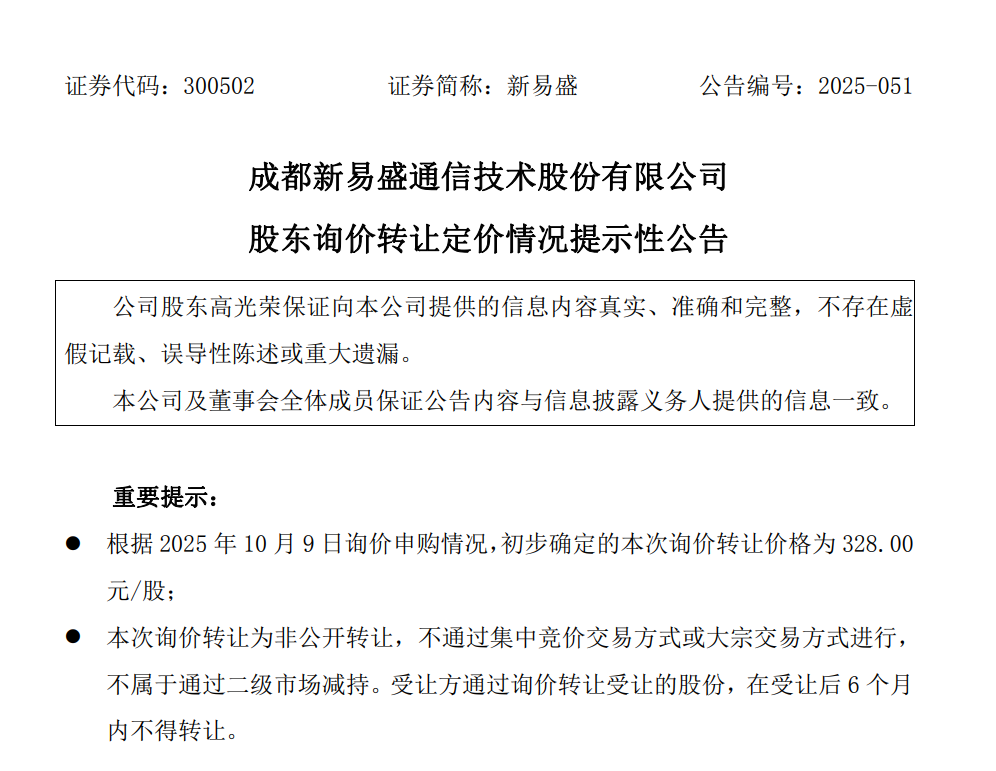 10月9日晚,新易盛(300502)公告称,根据2025年10月9日询价申购情况,公司股东高光荣的询价转让初步定价为328.00元/股。参与报价及申购的机构投资者家数为29家,有效认购股份数量为2926万股,对应的有效认购倍数为2.6倍。