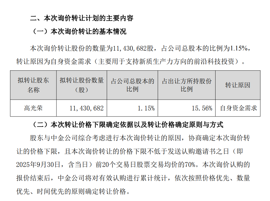 据公告,本次询价转让的价格下限不低于发送认购邀请书之日(2025年9月30日,含当日)前20个交易日股票交易均价的70%。