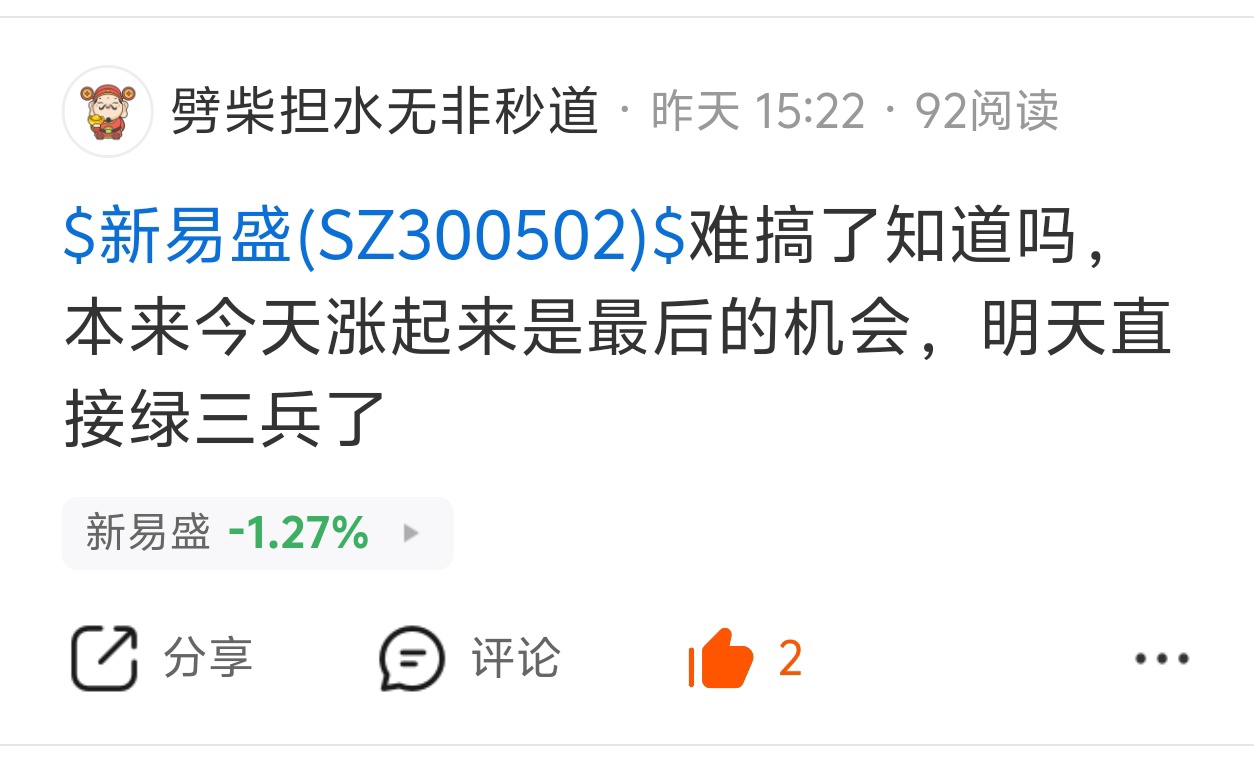 温馨提示: 1.根据《证券法》规定,禁止编造、传播虚假信息或者误导性信息,扰乱证券市场;2.用户在本社区发表的所有资料、言论等仅代表个人观点,与本网站立场无关,不对您构成任何投资建议。用户应基于自己的独立判断,自行决定证券投资并承担相应风险。《东方财富社区管理规定》