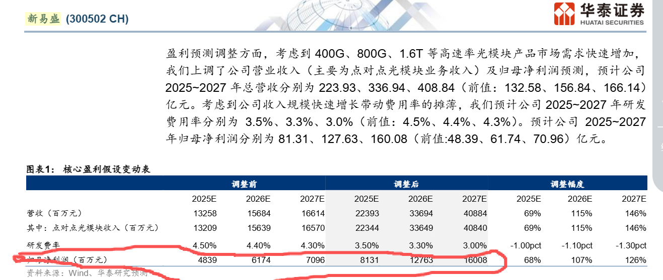 在中报业绩预告和中报后,有券商调高了新易盛的盈利预期。国泰海通预计新易盛2025-2027年的归母净利润分别为87.02亿元、119.19亿元和152.23亿元,华泰证券预计新易盛同期归母净利润分别为81.31亿元、127.63亿元和160.08亿元。