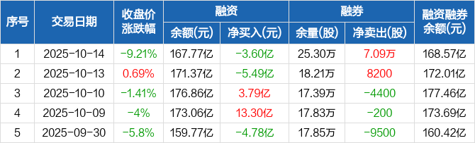 新易盛:融资净偿还3.6亿元,两市排名第四(10-14)