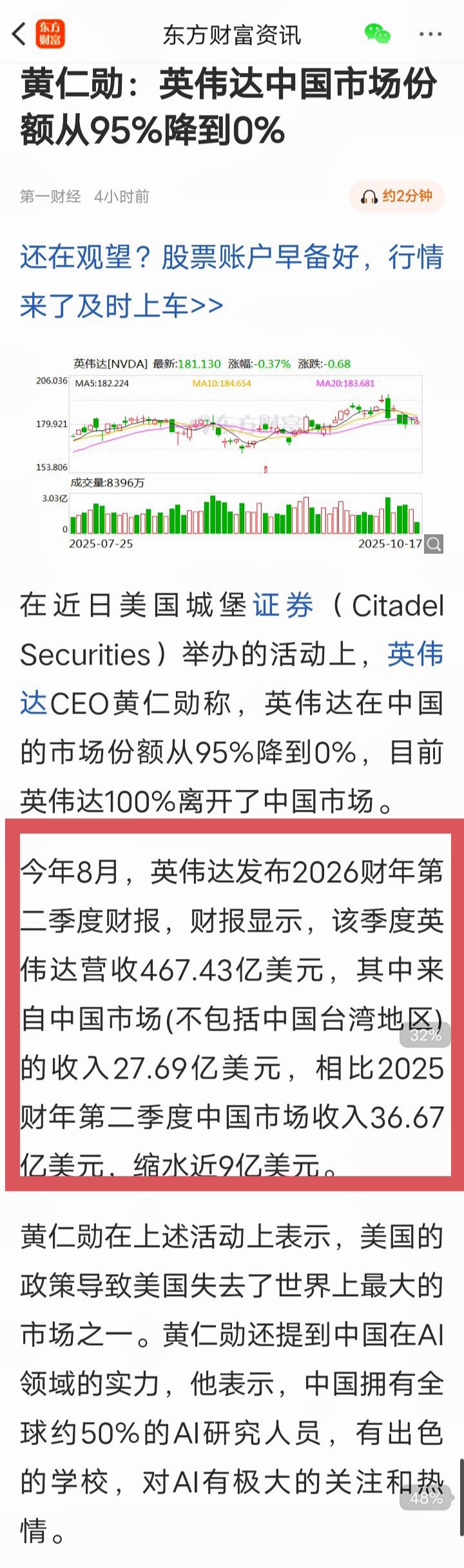 $新易盛(SZ300502)$ 东方财富17日晚消息: 今年8月,英伟达发布2026财年第二季度财报,财报显示,该季度英伟达营收467.43亿美元,其中来自中国市场(不包括中国台湾地区)的收入27.69亿美元,相比2025财年第二季度中国市场收入36.67亿美元,缩水近9亿美元。