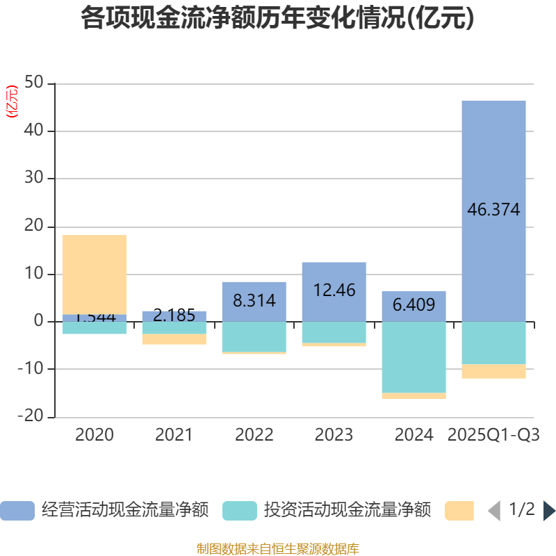 2025年前三季度,公司经营活动现金流净额为46.37亿元,同比增长1529.63%;筹资活动现金流净额-2.96亿元,同比减少1.77亿元;投资活动现金流净额-8.96亿元,上年同期为-7.99亿元。