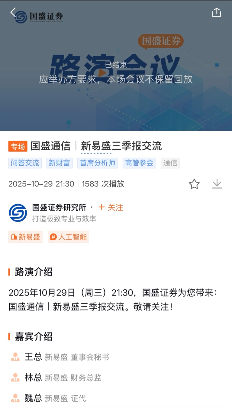 非常感谢国盛证券公司昨天晚上九点半组织的三季度业绩说明会,消除了市场对于新易盛三