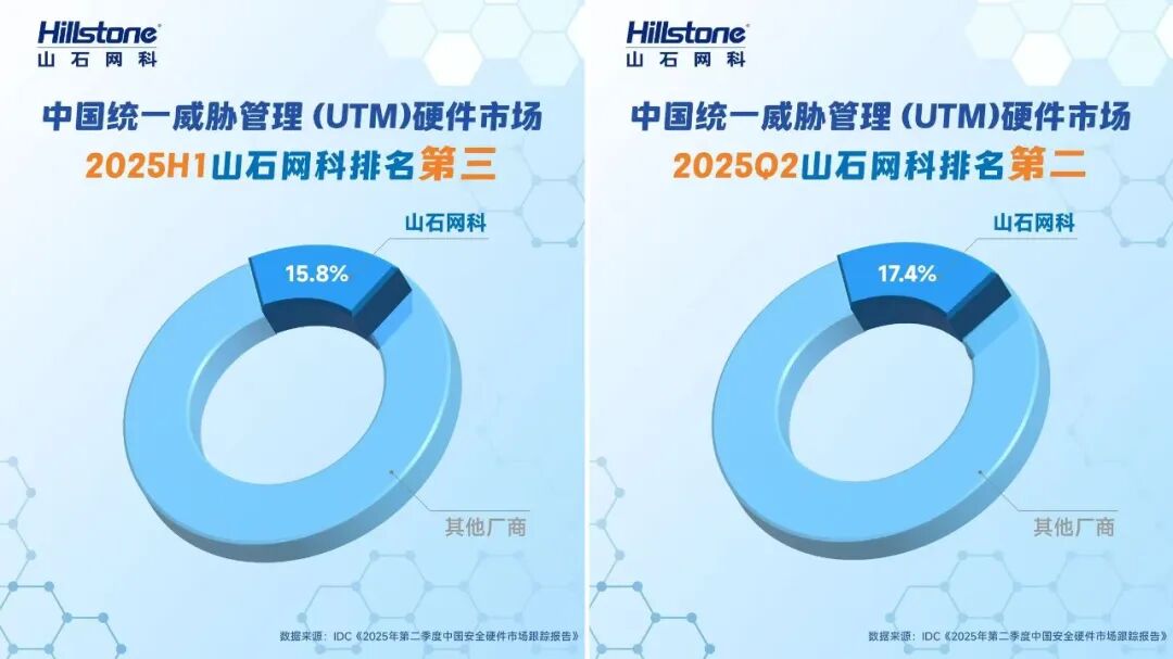 近日,全球领先的IT市场研究和咨询公司IDC发布《2025年第二季度中国安全硬件市场跟踪报告》。报告显示,2025上半年,山石网科在中国统一威胁管理 (UTM)市场中排名第三,市场占有率为15.8%;聚焦单季度表现,2025年第二季度,山石网科在中国统一威胁管理 (UTM)市场中排名第二,市场占有率为17.4%,再创新高,产品能力和创新体系获得市场高度认可。