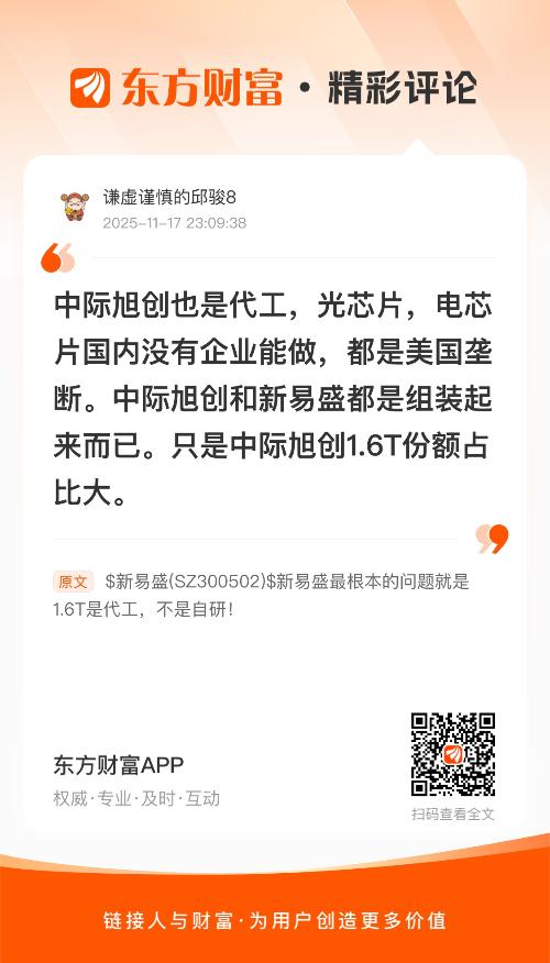 //@谦虚谨慎的邱骏8 : 中际旭创也是代工,光芯片,电芯片国内没有企业能做,都是美国垄断。中际旭创和新易盛都是组装起来而已。只是中际旭创1.6T份额占比大。