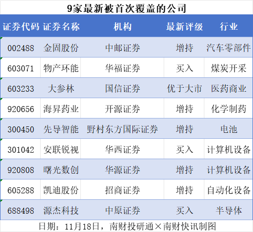 首次覆盖方面,11月18日券商共给出了9次首次覆盖,其中金固股份获得中邮证券给予“增持”评级,物产环能获得华福证券给予“买入”评级,大参林获得国信证券给予“优于大市”评级,海昇药业获得开源证券给予“增持”评级,先导智能获得野村东方国际证券给予“增持”评级。