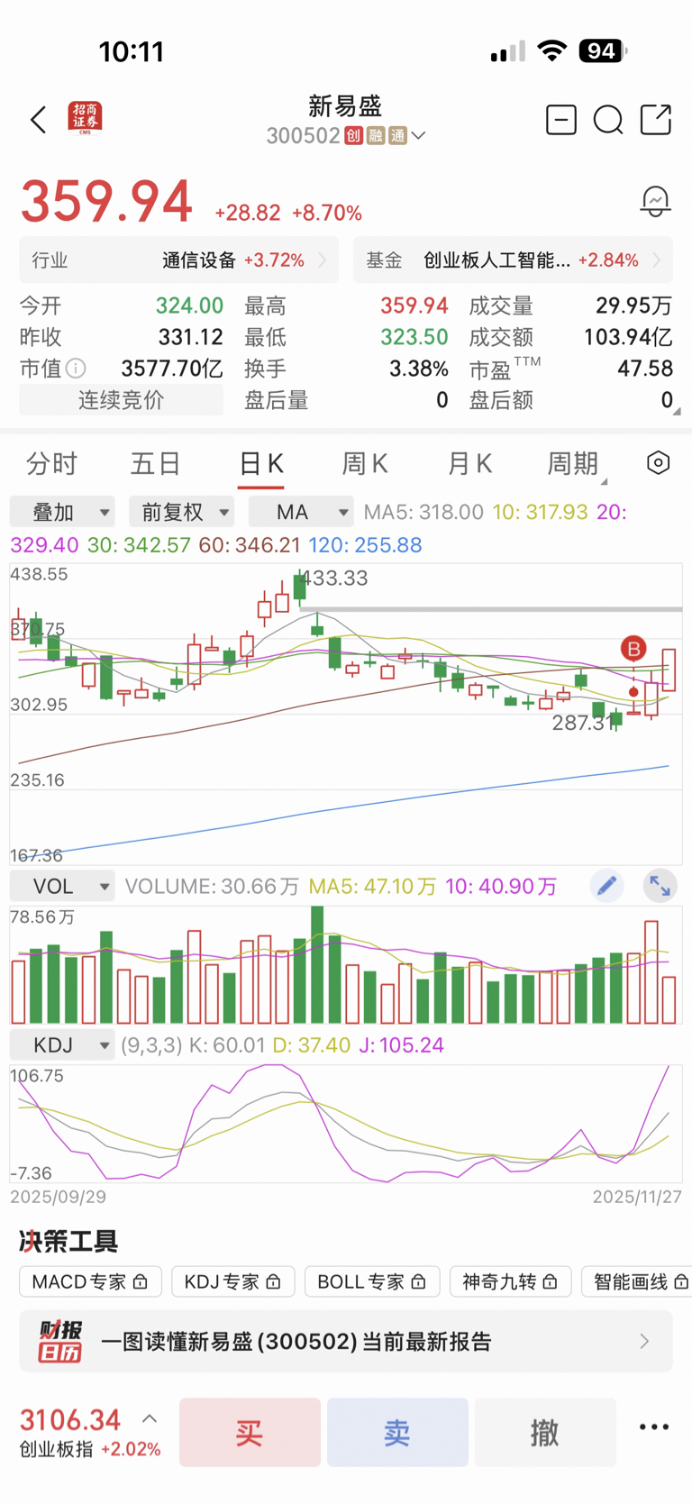 $新易盛(SZ300502)$ 前天买入,吃了两天肉,谢谢了,在想今天要不要出