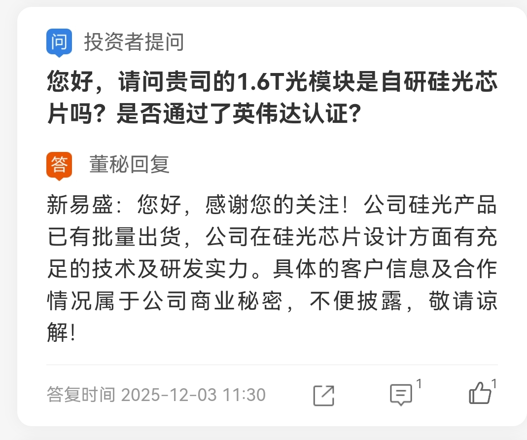 $新易盛(SZ300502)$ 这是明牌了?1.6T硅光产品已有批量出货!
