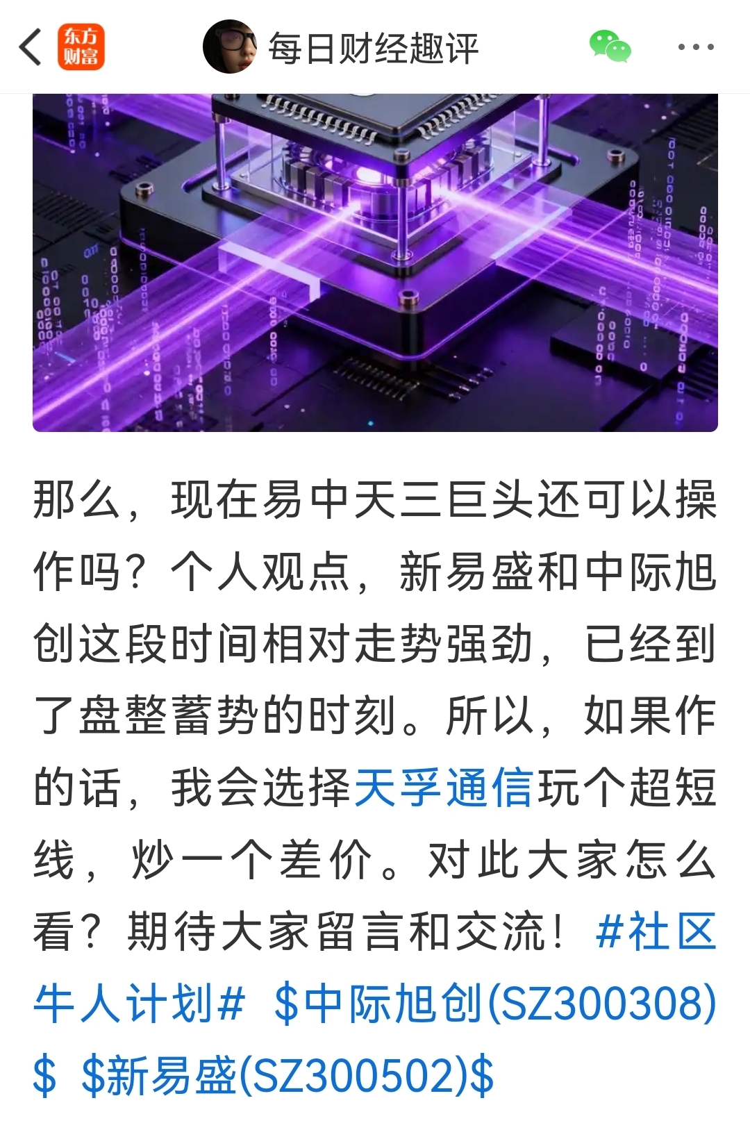 明天怎么操作,总体而言,谨慎观望,而天孚通信我个人觉得冲高落袋也许是更好的选择。对此大家怎么看?期待大家留言交流!#社区牛人计划# $新易盛(SZ300502)$ $中际旭创(SZ300308)$ $天孚通信(SZ300394)$