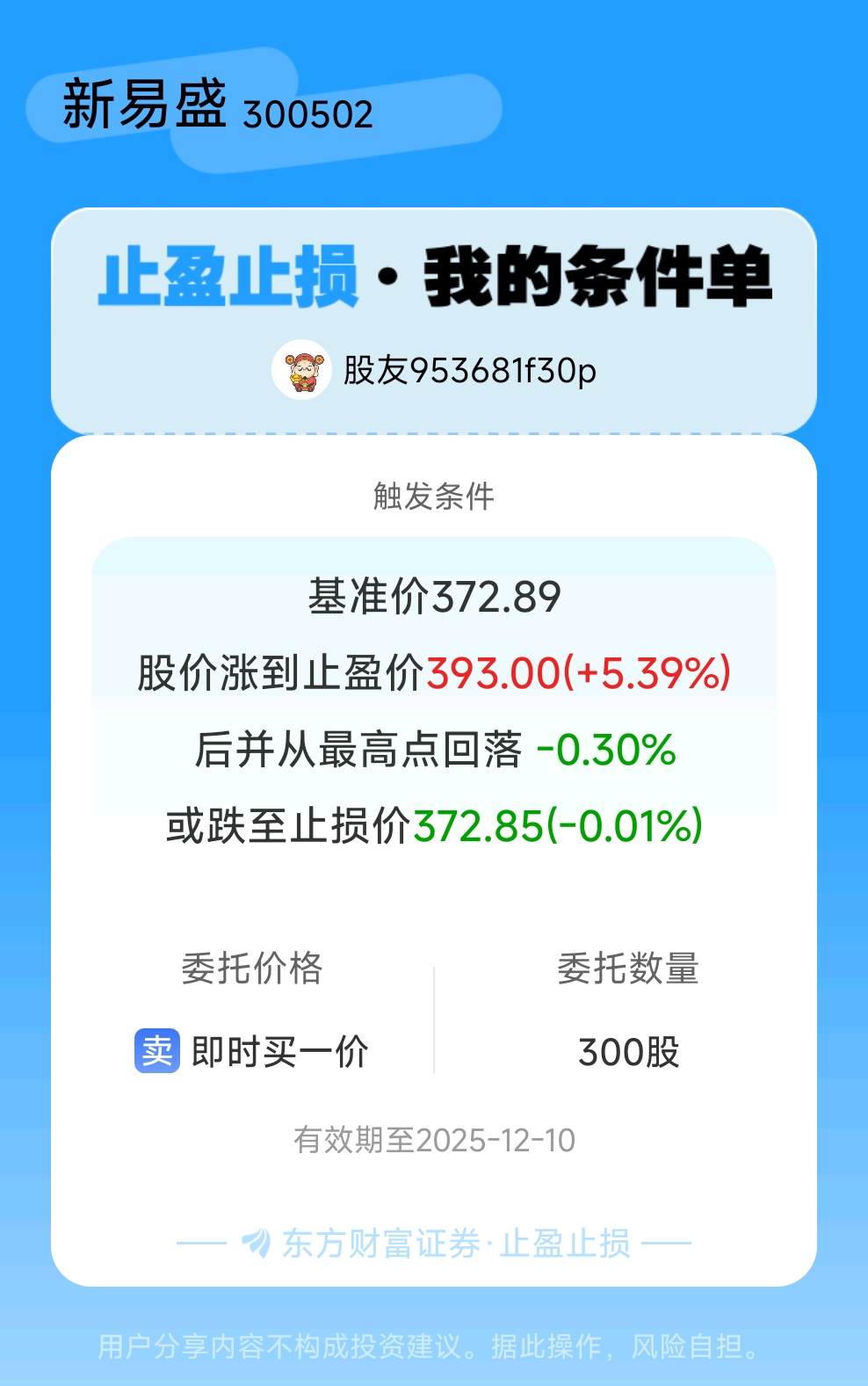 #条件单交流# #止盈止损晒单# 一位股神设置了一个止盈止损条件单,接下来就是见证奇迹的时刻~$新易盛(SZ300502)$