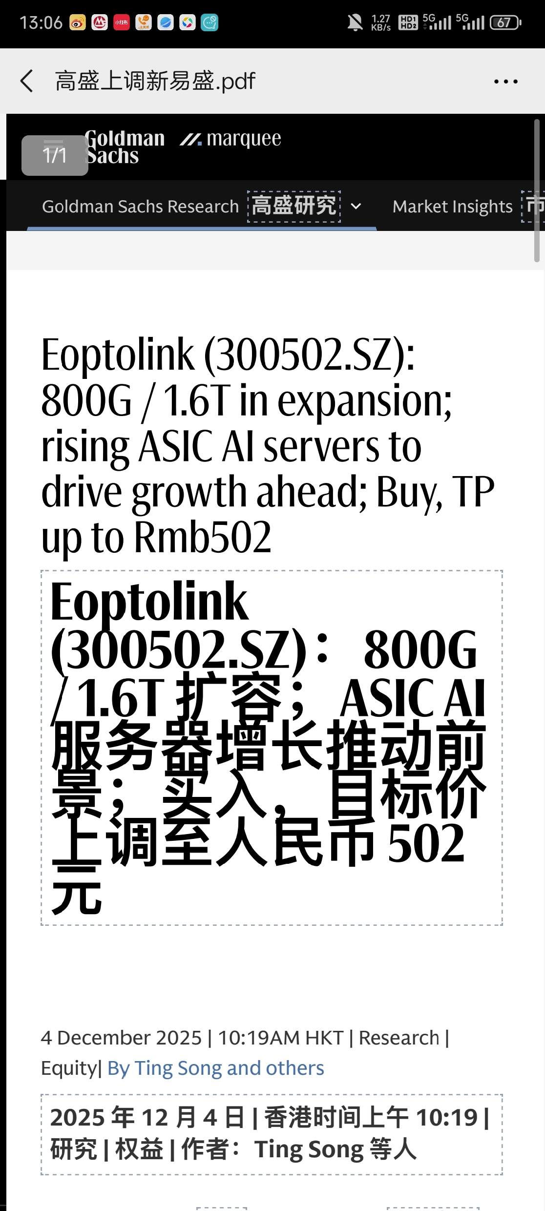 $新易盛(SZ300502)$ $中际旭创(SZ300308)$ 紧接着中继续创之后,高盛也上调了兴业盛的目标价,12个月502元。